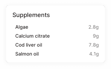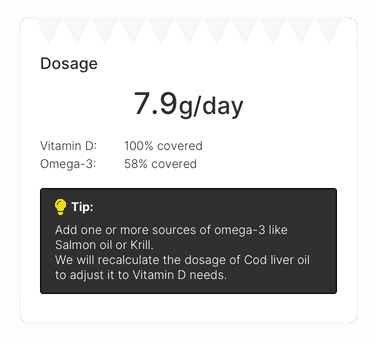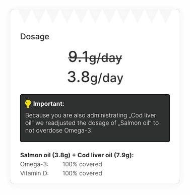 By adding another omega-3 source like Salmon oil, we are able to cover Vitamin D and Omega-3 in 100%.