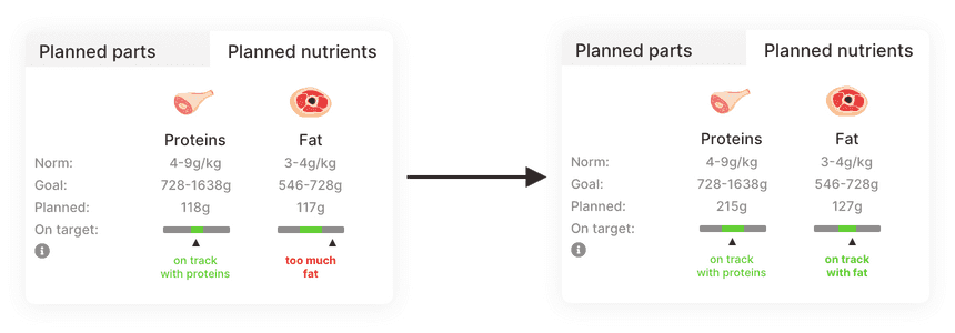 With goals for plan you’ll see how adding particular meat affects the plan realization. Everything calculates in the fly!